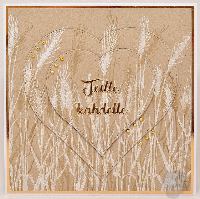 näin syyspuintien aikaan sopinee tällainen hääkorttikin jo julkaista, kun juhlat on jo juhannuksena juhlittu...kaivoin vanhan ihanan hero artsin heinäleiman esiin ja leimasin ensin valkoisella maalilla, päälle toinen kerros ruskeilla musteilla...keskeltä stanssasin sydämen muodot ja kiinnitin takaisin korttiin kohotettuina eri tasoihin...lisäksi kortissa vaan stanssattu teksti ja puolihelmet... =)
